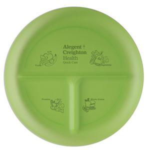 5. Food Portion Plates. This inexpensive promotional item is perfect for kicking off a wellness program. The durable plate is divided into three areas each labeled for the appropriate, healthy amount of protein, fruits and vegetables, and starches or grains. It comes in a variety of fun colors to make sure your promotional item gets noticed. This food portion plate is PERFECT for programs educating kids on making healthy eating choices.