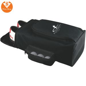 This high quality golf shoe bag makes carrying your golf shoes a breeze. There is a side mesh compartment for golf balls or shoe spikes as well as a separate compartment to accommodate polish, shoe mitt, etc. Nylon webbed carry handles make it easy to hook to your golf bag or carry. Plus, there is a nice, large space for your logo or marketing message.